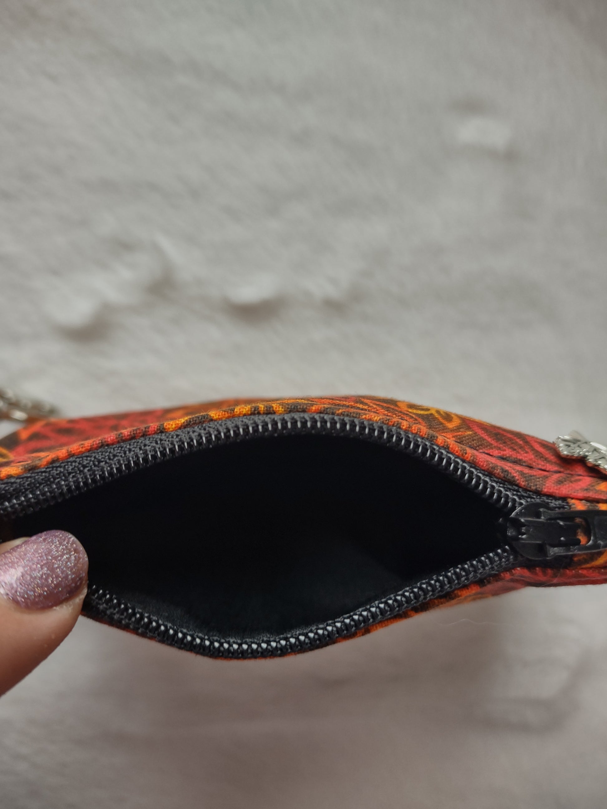 This keychain coin purse is so cute and perfect for the fall season. This bag is made out of black cotton that has orange, yellow and red leaves on it. I added a black zipper. The bag is lined with black cotton. I added a silver leaf charm to the zipper. These bags are great for change or other small accessories that you want to keep track of.