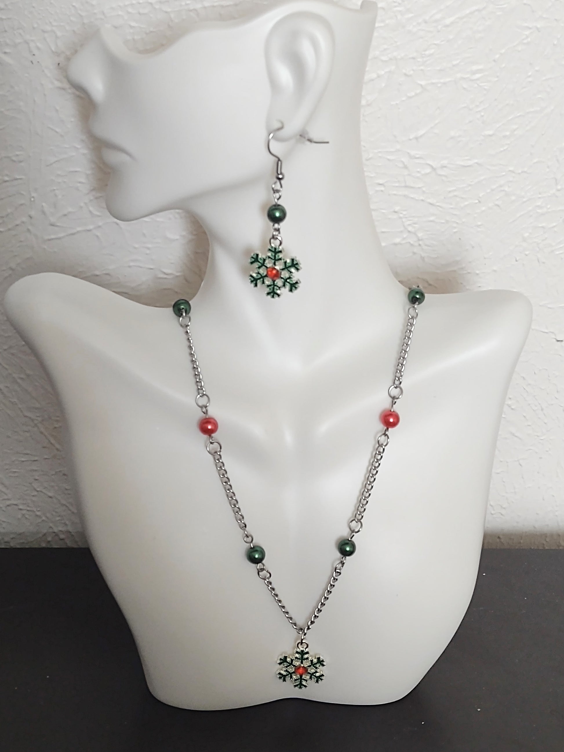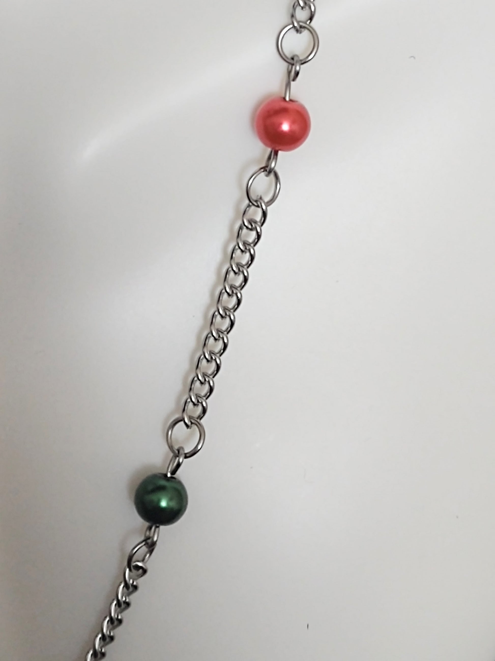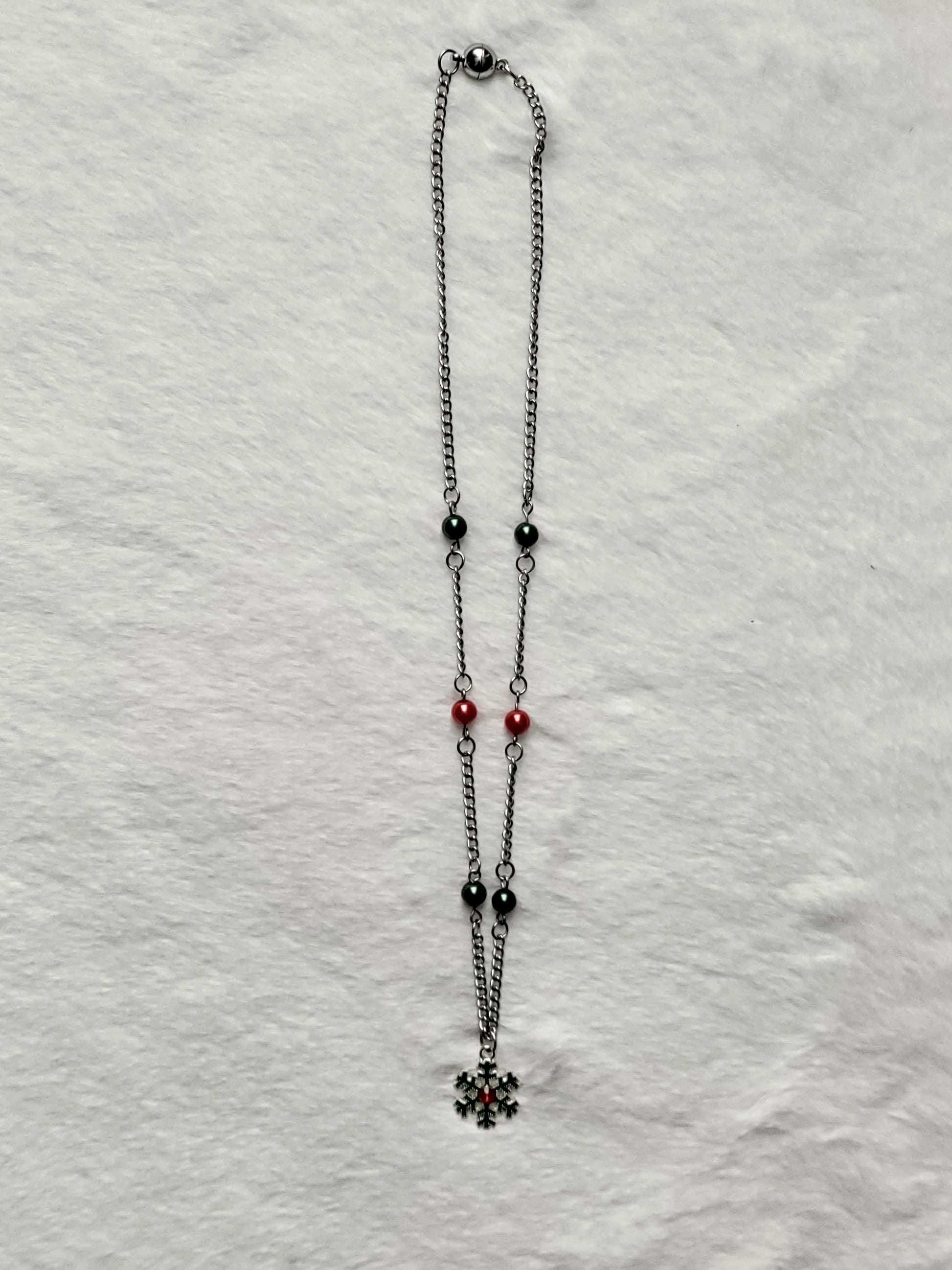 This necklace would be so cute to add to your holiday jewelry collection. The green and red snowflake charm makes it easy to pair with your green or red Christmas wear. This would be the perfect piece to wear to your holiday party. The red and green glass pearl beads add extra holiday spirit to the silver necklace chain. This necklace comes with 2 clasp options. Both clasp options come with a 3 inch extender making it the perfect piece for your layered holiday look.