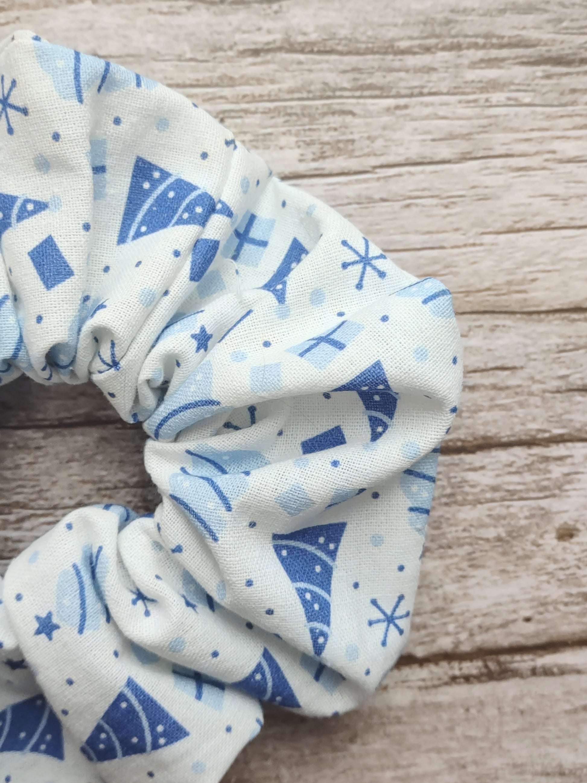This fabric is so cute and perfect for Christmas. The hair scrunchie is made out of white cotton. The cotton has light blue Christmas tree print on it. This would be the perfect item for a stocking stuffer. I use the smaller elastic so these hair scrunchies are perfect for multiple hair types.