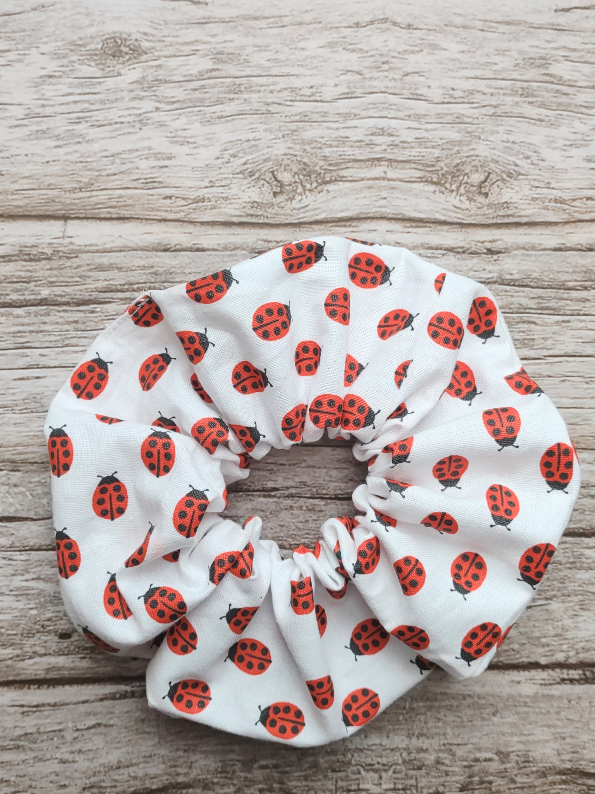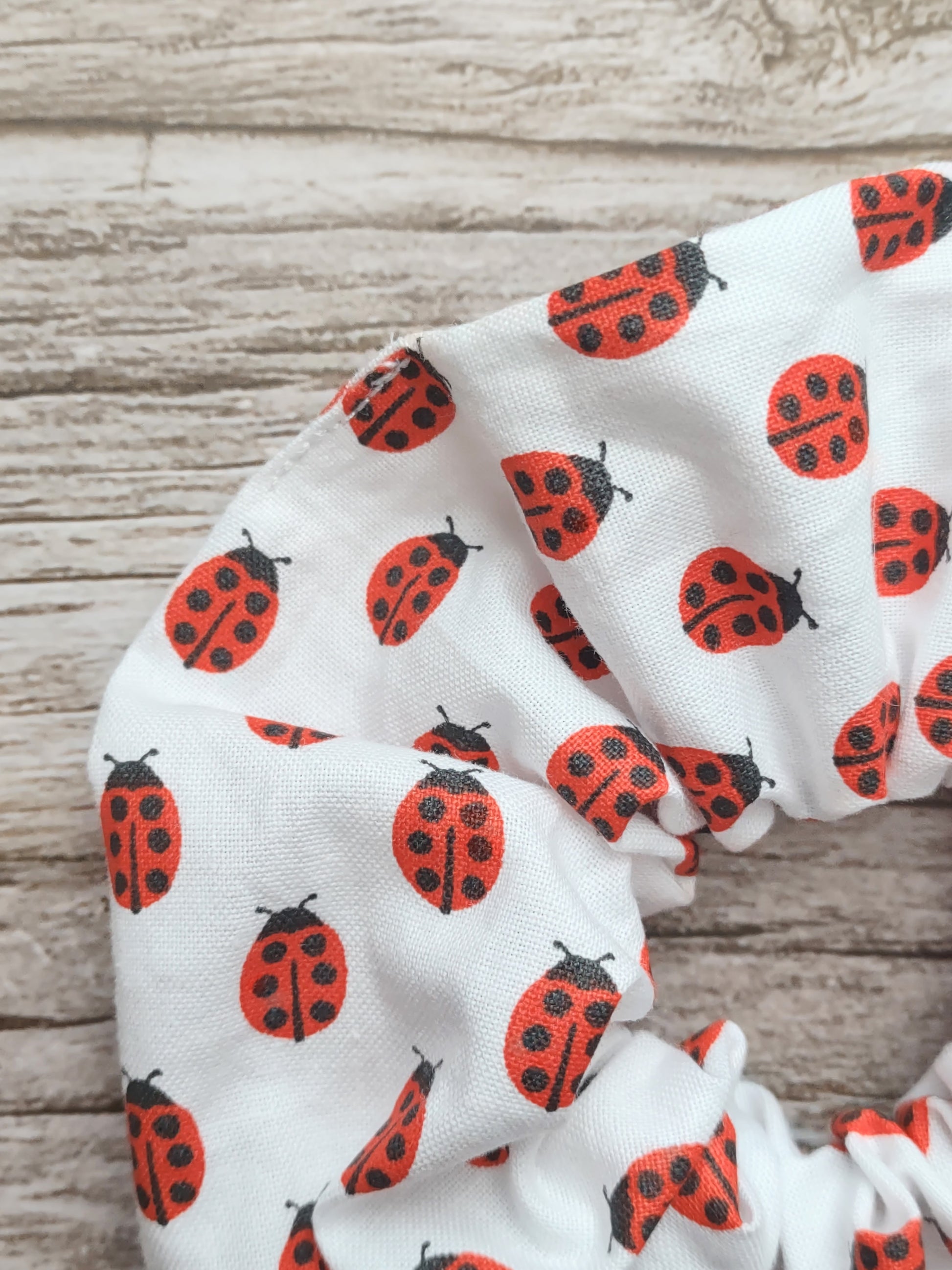 "Lady Bugs" White Cotton Ladybug Print Hair Scrunchie