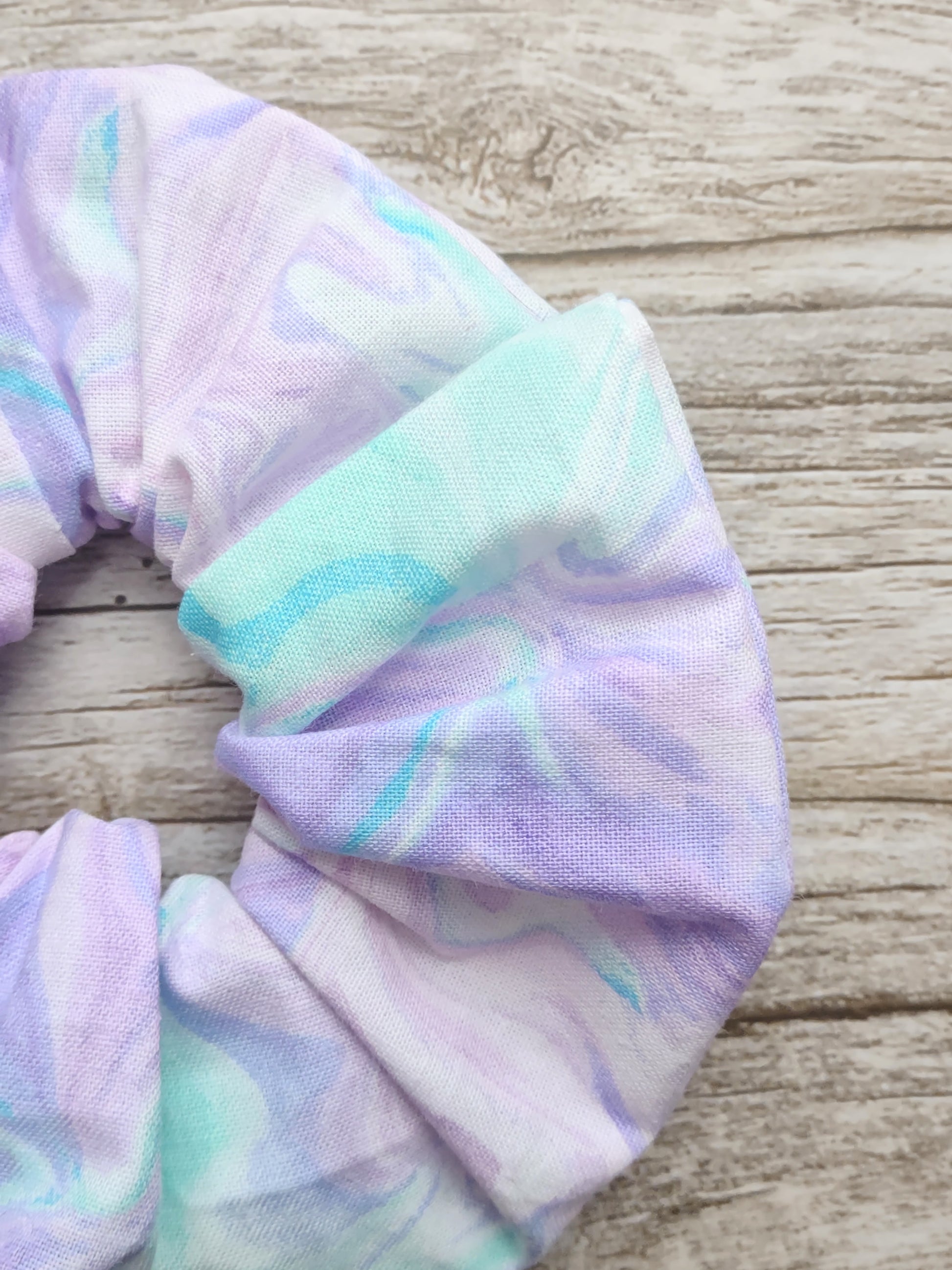 This fabric is so pretty. The hair scrunchie is made out of white cotton. The cotton has a turquoise and purple marble print on it. I use the smaller elastic so these hair scrunchies are perfect for multiple hair types.
